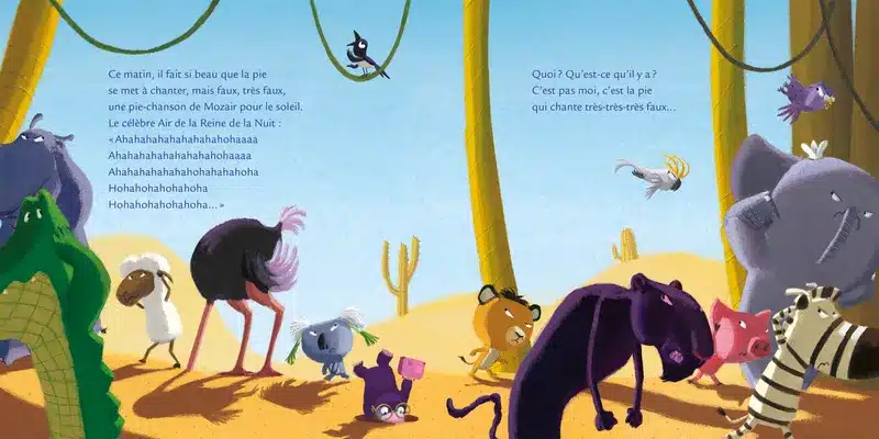 Une pie, ancienne chanteuse d’opéra, s’époumone même si elle a perdu sa voix. Elle chante si faux que même le Soleil refuse de se montrer. Mais la pie est persuadée qu’elle peut le ramener. Résultat : pluie, neige, tempête, les autres animaux sont désespérés. Réussiront-ils à faire revenir le Soleil ?