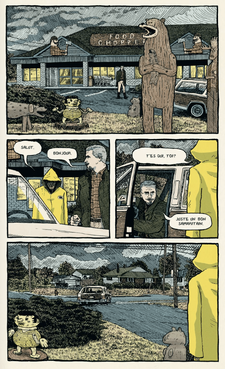 Le dessin d’Alexander Forbes participe pleinement à cette réussite. Son trait stylisé, très lisible, donne immédiatement une identité forte au livre. Sous une apparente simplicité graphique, l’artiste sait faire naître une vraie tension, notamment dans les scènes nocturnes, les regards, les attitudes et les décors de cette ville isolée. Cette économie de moyens renforce paradoxalement l’étrangeté du récit et lui confère une personnalité visuelle marquante.