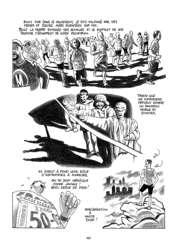 Les globules rouges deviennent des personnages à part entière de l’aventure du héros aux côtés de ses amis rompus à l’exercice et de cette épouse coureuse depuis le berceau ou presque. Le héros se fixe un objectif quasi irréalisable pour une belle aventure humaine aux frontières de sa volonté. Parviendra-t-il à rallier le 42e kilomètre au coeur de Central Park après avoir traversé Statten Island, Brooklyn, le Bronx et Manhattan? Il faut lire la BD pour le savoir au gré des magnifiques dessins à l’encre de Chine et de ce Noir&Blanc élégant.