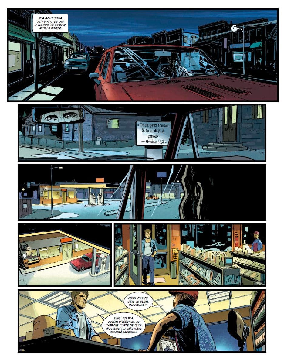 La grande force de Presidio réside dans sa capacité à transformer le décor en véritable acteur du récit. Les routes interminables, les villes désertées et les paysages arides deviennent le reflet direct de l’état psychologique des personnages. Le dessin de Guiu Vilanova renforce cette impression d’isolement et de fatalité : les visages sont marqués, les silences pesants, et chaque planche semble chargée d’une tension latente. Le récit adopte un rythme volontairement posé, laissant au lecteur le temps de ressentir l’inéluctabilité de la trajectoire empruntée.