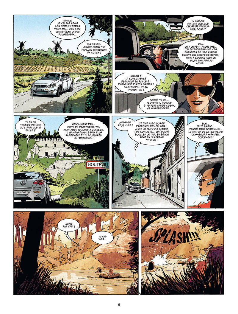 Cognac, la part des démons nous plonge dans l’univers très particulier des spiritueux et en particulier celui du Cognac. On connaissait le célèbre manga japonais Les gouttes de Dieu au succès incontestable sur le thème du vin, suivi d’une multitude de séries BD comme Le sang de la vigne ou encore Bodegas. Alors, en voyant une couverture comme celle de Cognac, on s’est dit que c’était peut-être du déjà vu. Les auteurs Jean-Charles Chapuzet, Corbeyran, Luc Brahy et Aurore Folny nous livrent ici une enquête journalistique dans le monde très fermé et jalousé des distillateurs. L’intrigue : Anna-Fannély Simon, journaliste au caractère bien trempé, un poil vulgaire, mais talentueuse, doit réaliser un reportage sur la ville de Cognac pour le National Geographic. Fille du pays, ses contacts avec les habitants y sont facilités. Mais elle apprend au cours de ses rencontres que son amie d’enfance, Alice, a été assassinée par son mari qui se serait suicidé par la suite. Ne croyant pas à la version des inspecteurs, elle mène alors une véritable enquête policière.