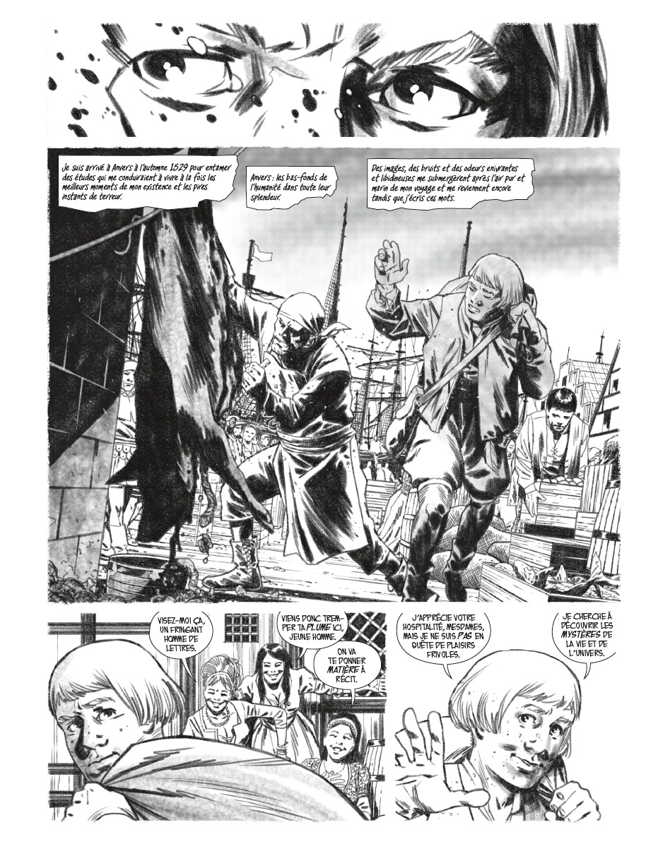 Graphiquement, Charlie Adlard délivre un travail puissant et texturé, qui capture autant la pesanteur des ruelles d’Anvers que la violence latente des scènes de confrontation. Son style, riche en contrastes et en détails, renforce l’immersion dans cet univers à la fois historique et inquiétant.