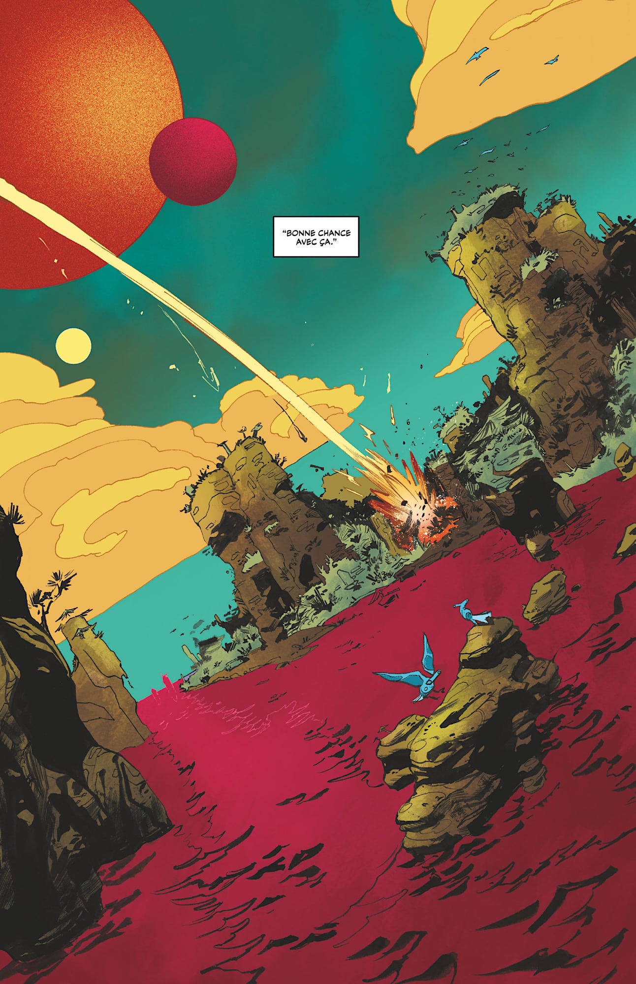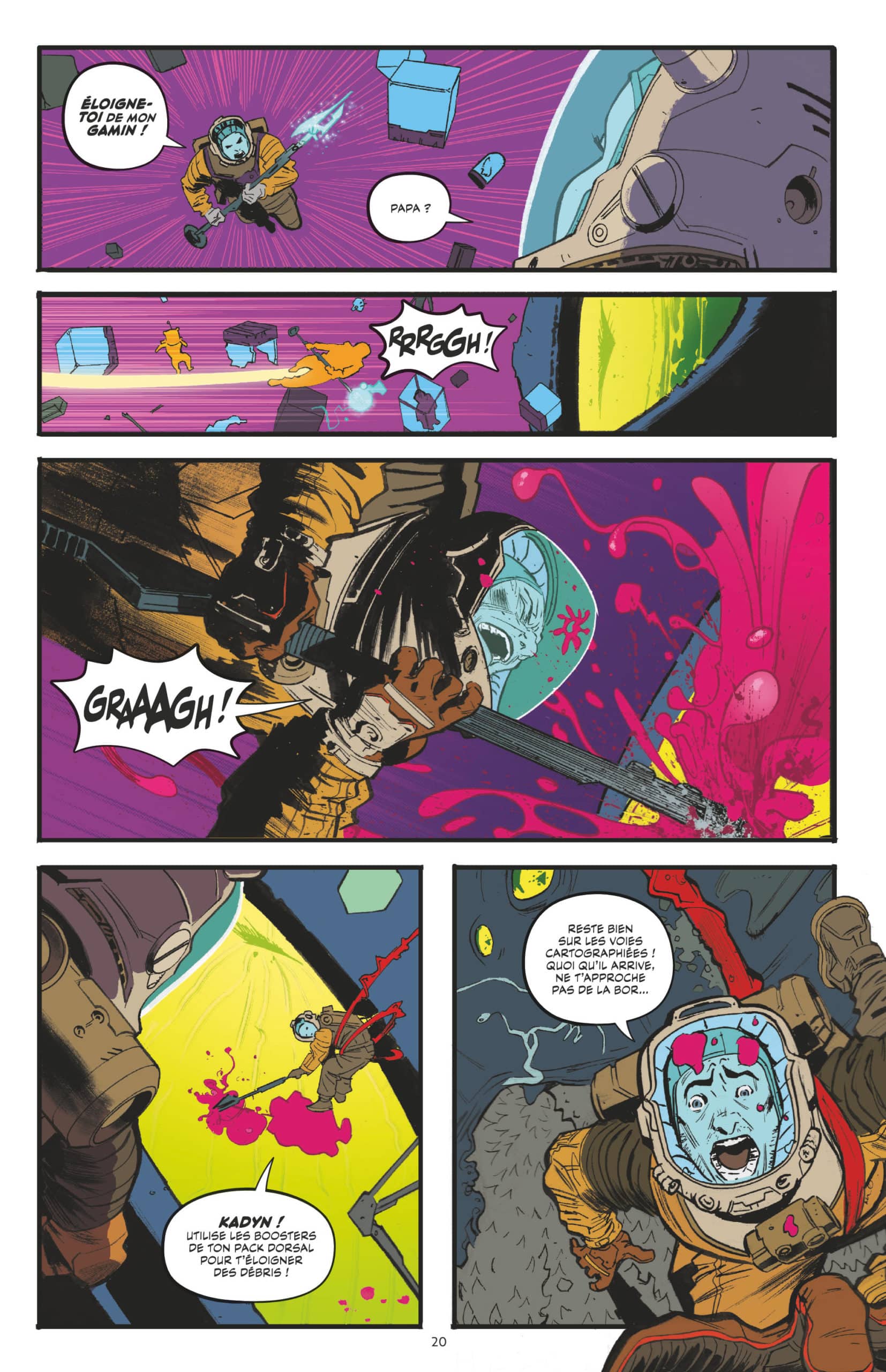 Une aventure en miroir où l’onirisme des uns est chahuté par l’instinct de survie des autres. Comme si deux mondes entraient en collision : celui des enfants et celui des adultes. La narration souffre parfois de cette frontière trop nette qui ne permet pas toute la fluidité qu’aurait mérité le récit. Mais le dessin demeure un très bon atout pour cette histoire bariolée de couleurs et de créatures fantastiques. L’influence d’Alice aux Pays des merveilles version galactique n’est pas très loin.