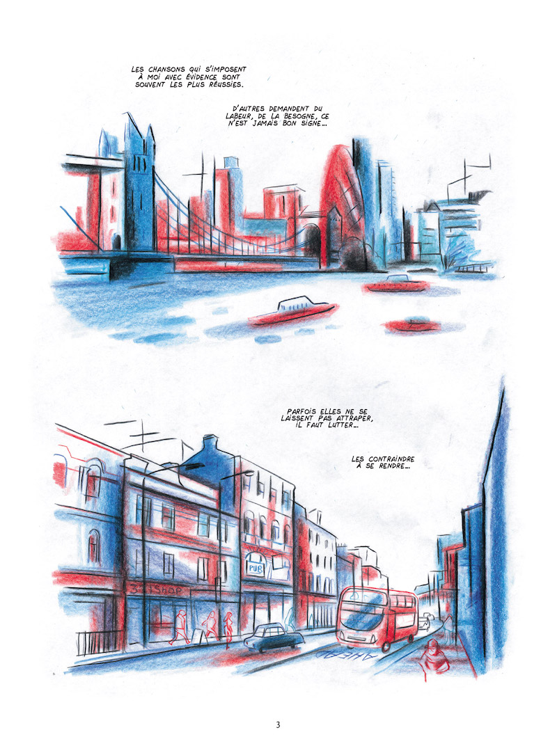 Une fois les 140 pages avalées me vient cette réflexion. David Chauvel et Alfred semblent laisser la plume à un chanteur qui se livre à un récit quasi autobiographique. A qui s’adresse Etienne Daho ? Ses fans boiront ses commentaires aussi religieusement qu’ils écoutent chacun de ses nouveaux albums. Les débutants en Etienne Daho préfèreront passer par la case écoute des albums avant de côtoyer de si près un chanteur encore inconnu. Les contempteurs ne se donneront pas la peine de creuser le sillon d’un chanteur qu’ils méprisent. J’en oublie que ce n’est pas Daho qui guide l’ouvrage, c’est une BD sur Daho avec quelques incursions du chanteur. Les frontières sont floutées et il faut de nombreux passages sur les innombrables qualités du chanteur pour se souvenir. Les hommages continuels sont autant de rappels que le discours ne peut être que très policé pour faire le tour sans encombres de sa personnalité publique. Mais le Daho privé reste insondable et insondé. Toujours ce besoin d’auto-protection… Si les auteurs semblent se départir de tout recul, cela touche vraisemblablement à leurs visées. Il s’approchent si près du chanteur qu’ils sont comme fascinés et oublient le regard critique.