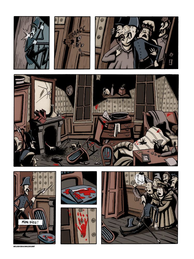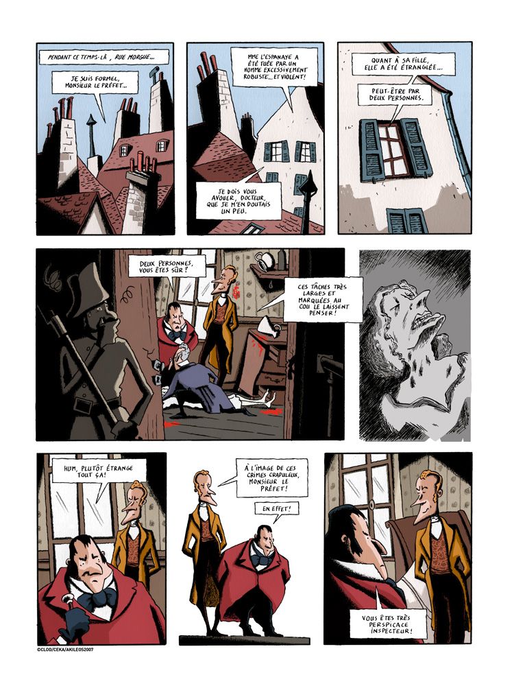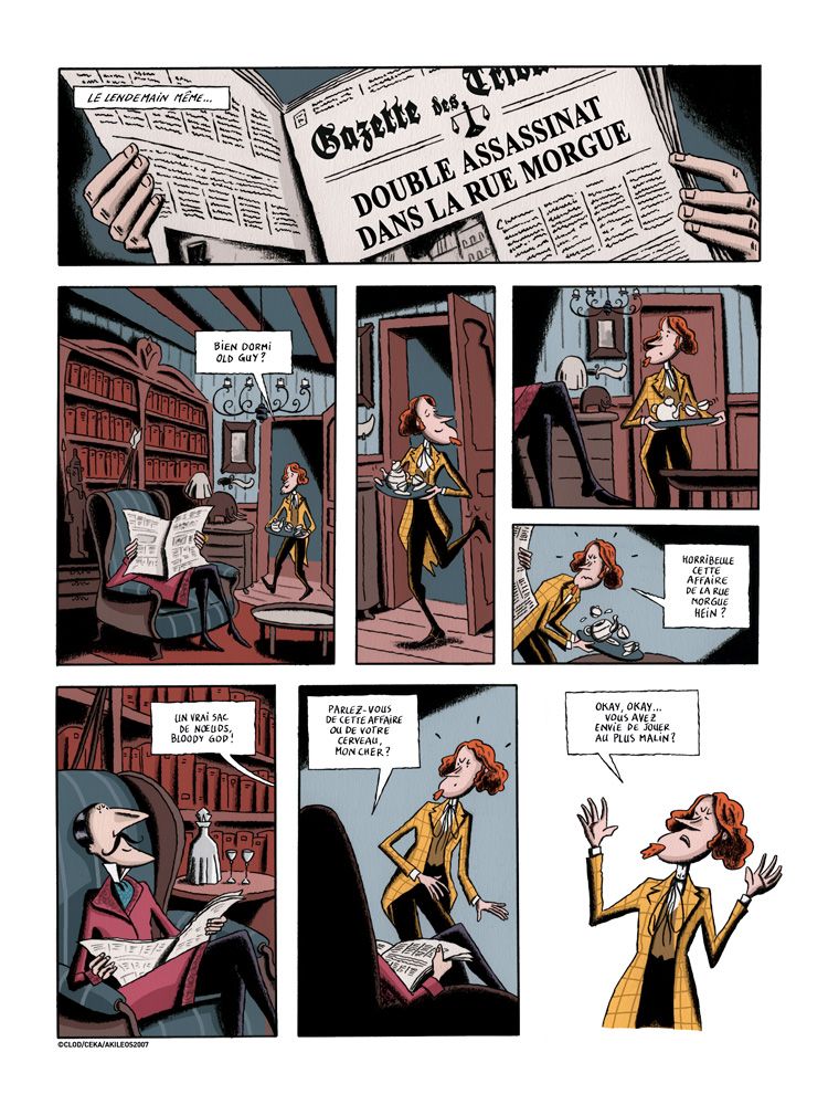 Ceka et Clod adaptent la nouvelle d’Edgar Allan Poe Double assassinat dans la rue Morgue en apportant leur touche personnelle pour une BD truculente à lire. Le texte est évidemment respecté à la lettre avec un surplus d’humour et un dessin dynamique pour une lecture à la fois divertissante et enrichissante.