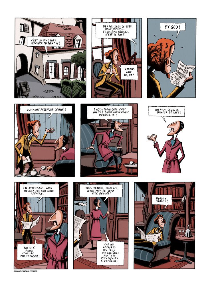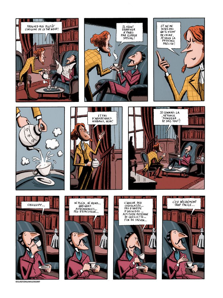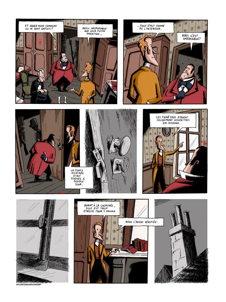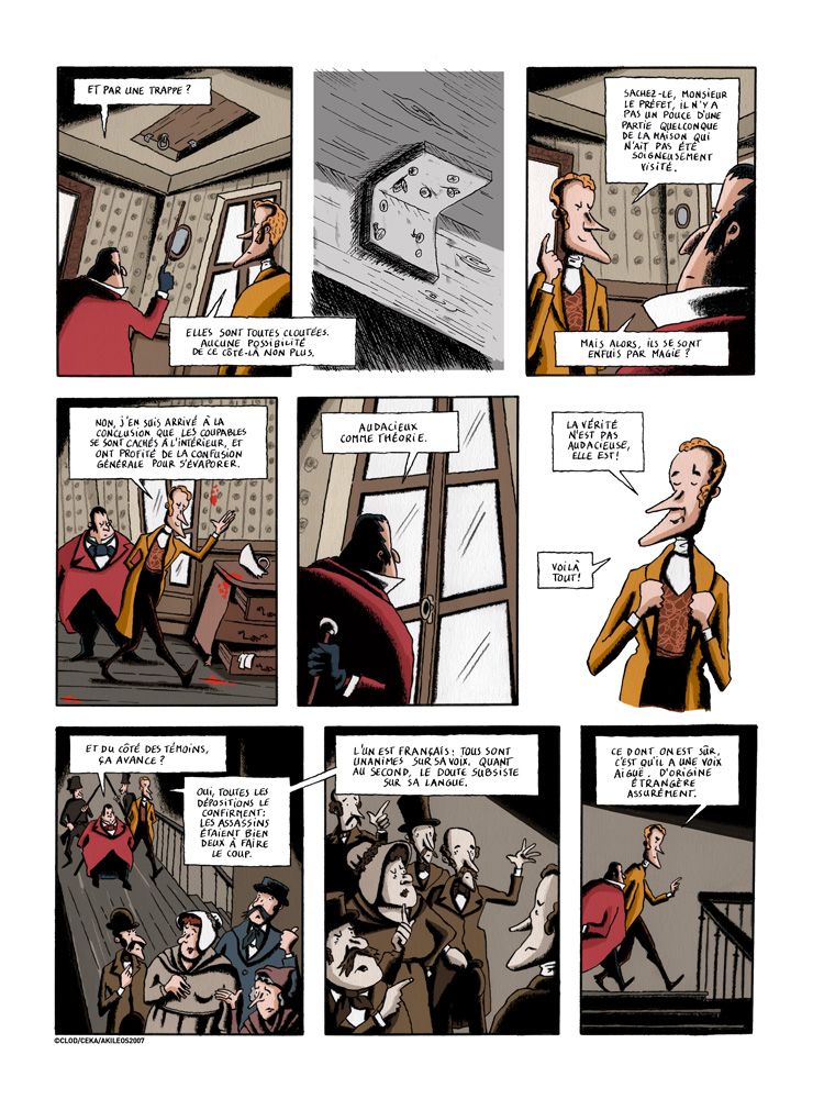 La BD se lit comme un roman policier avec un Paris entre fantasme et réalité. Les immeubles sont de travers, le trait est dynamique et porte un récit qui ne laisse pas de récit. Le détective Dupin et son acolyte english préfigurent Holmes et Watson avec la même truculence évoquée dans la série télévisée récente. Le premier enchaine les analyses et déductions, le second essaye de suivre tant bien que mal. Edgar Allan Poe fait paraitre la nouvelle en avril 1841 là où Sir Conan Doyle donne vie à son détective en… 1887. La même agilité intellectuelle et ce sens aigu de l’observation donnent aux détectives l’art de résoudre les cas les plus ardus.