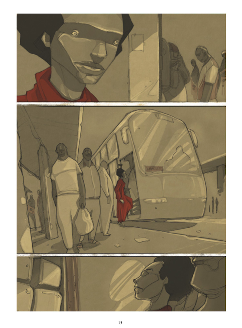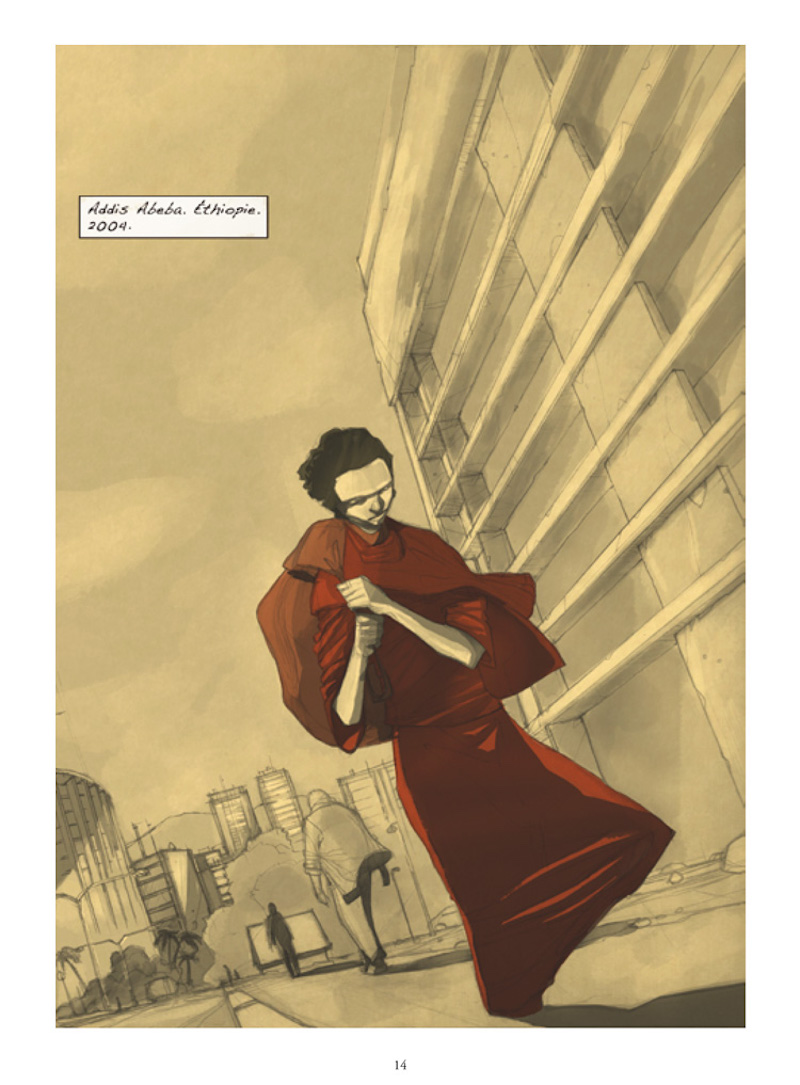 Etenesh, l’odyssée d’une migrante est le récit incroyable et glaçant d’une jeune femme éthiopienne nommée Etenesh qui « choisit » de fuir sa situation d’esclave, sa ville d’Addis Abeba, son pays. On se retrouve plongé, par son récit introspectif, dans les tourmentes intérieures et extérieures qu’elle subit. Le récit est pauvre, mais les images se suffisent à elle-même. On vit la violence, on la ressent même. C’est un récit d’une profondeur extrême qui nous fait découvrir avec effroi le chemin de ces migrants jusqu’à l’Italie. Les morts sont nombreux et leur condition à l’arrivée difficile. Amnesty International s’est associée à cette publication, car cette bande-dessinée doit servir de témoignage, pour montrer aux yeux de tous ce qu’il se passe pas si loin de chez nous. On est profondément touché par la dureté de cette vie qu’ils n’ont pas choisie. Les dessins de Paolo Castaldi, tels des tableaux berbères à chaque bulle sont aussi intenses.