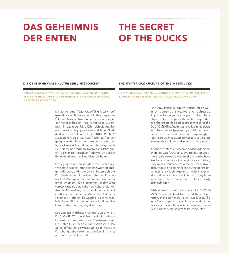 Mais ce qui est surprenant, c’est que cela fonctionne extrêmement bien. Ce très bel ouvrage a été réalisé par le collectif Interduck, né 1982 au sein de l’Ecole Supérieure des Beaux-Arts de Brunswick en Allemagne, sous la direction du professeur Eckhart Bauer. Né d’un projet un peu fou de représenter les différentes œuvres artistiques (peintures, sculptures, concepts) en les revisitant à la sauce « canards ».