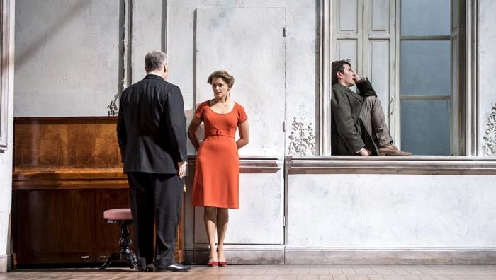 Elle prend pour cadre le salon d’un bel hôtel particulier (scénographie d’Eric Ruf) desservi par trois escaliers intérieurs qui reprend vie après une période de deuil de la jeune maîtresse des lieux (Célimène) où les joutes verbales, les faux-semblants, les confidences interagissent avec force et fluidité.