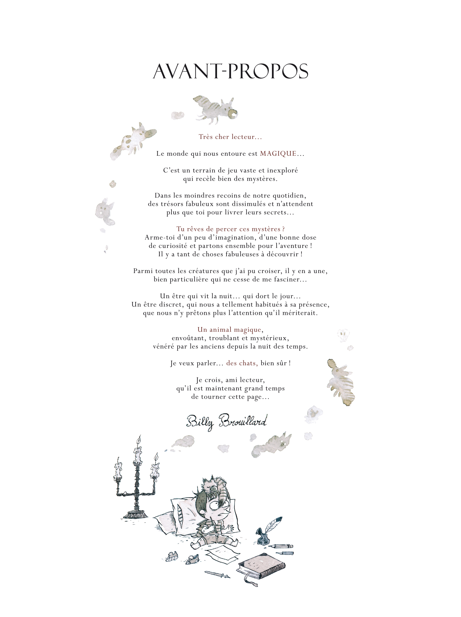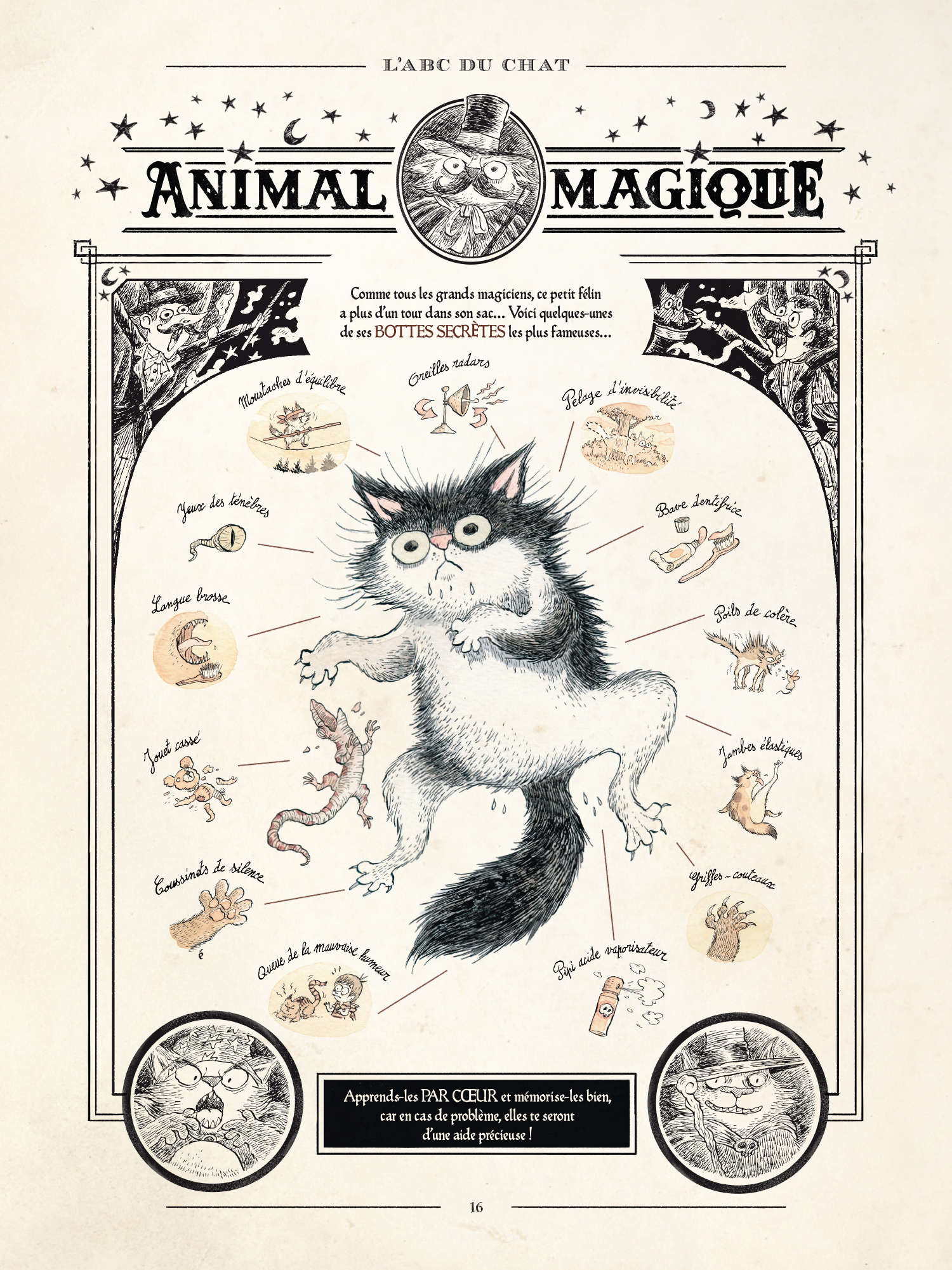 À l’instar du premier volume de cette encyclopédie, ce second opus – consacré aux chats – est scindé en trois parties : L’ABC du chat, Histoires de chats et Trucs & Astuces Matoumatiques. Les L’ABC du chat répond à toutes les questions liées à cet animal, grâce à Billy Brouillard qui s’interroge avec humour et curiosité : Comment les chats font-ils pour ronronner ? Pourquoi enterrent-ils leurs cacas ? Comment font-ils pour se lécher les orteils ? Etc. Dans Histoires de chats, un voile se lève : Billy raconte tout sur son regretté chat, Tarzan, sur son tricot super capuche et surtout, sur… la GENÈSE DE SON DON DE TROUBLE VUE ! Enfin, la rubrique Trucs & Astuces Matoumatiques propose une série d’exercices très spéciaux qui permet d’acquérir les aptitudes des chats et de devenir, comme Billy, un… super héros ! Ne le répétez pas, mais… le chat, c’est un animal… MAGIQUE !