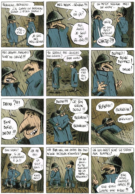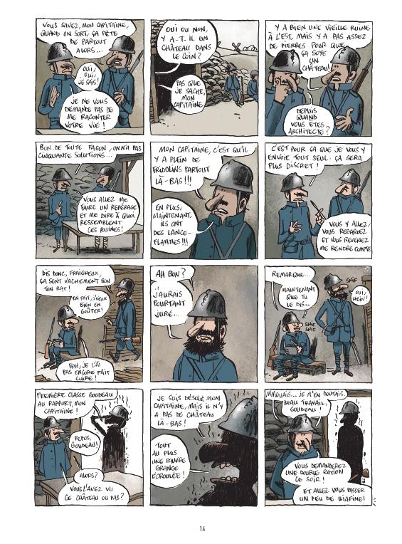 Confrontés au drame et à la boucherie de la grande guerre, ces hommes survivent et parviennent à nous faire rire en répondant à la violence des canons avec l’arme ultime : leur folie ordinaire. Généraux belliqueux et lâches, officiers acariâtres et dépassés par les évènements, soldats débrouillards et solidaires, tous ces poilus forment un monde délirant où tous les coups semblent permis. Certains jouent au rugby avec des grenades, d’autres creusent en pensant trouver le trésor des Templiers, bref, dans l’enfer de tranchées de Guillaume Bouzard, on sait aussi s’amuser…
