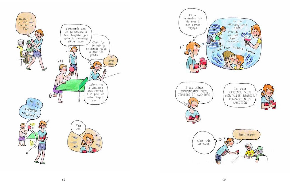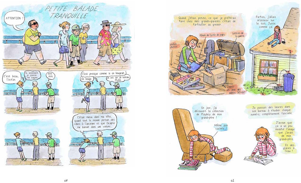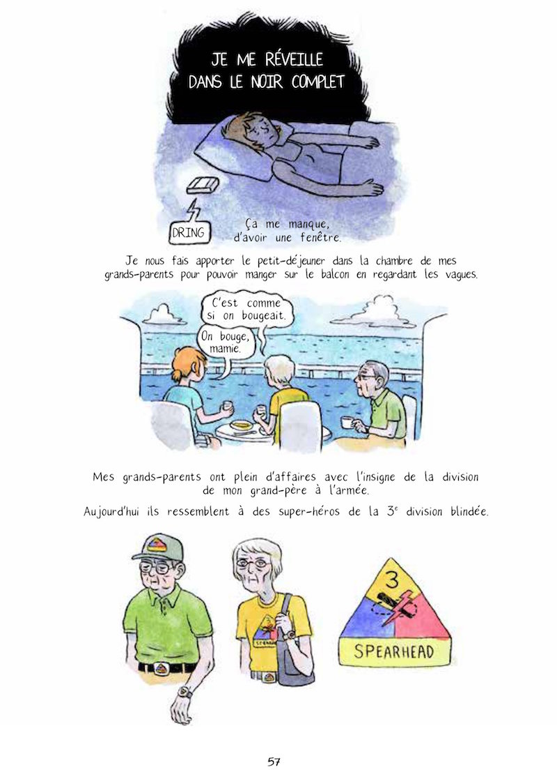 Jamais Lucy n’aurait imaginé échapper aux rigueurs de l’hiver sur un bateau de croisière dans les Caraïbes. Recrutée par sa famille pour accompagner ses grands-parents, la voilà pourtant bien partie pour dix jours d’escapade tropicale. Promenades sur le pont, buffet médiocre, bouleversant carnet de souvenirs de guerre de son grand-père, voisins de table flippants, rares moments de quiétude à la piscine, soirées spectacles d’un goût discutable, pharmacopée envahissante… les péripéties et les crispations ne manquent pas. La tendresse non plus. Lucy Knisley mélange savamment humour et délicatesse. Ses lignes et aquarelles douces servent une façon unique de montrer sans dire une certaine mélancolie.