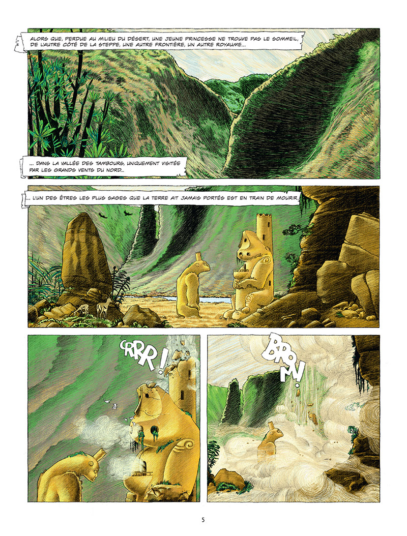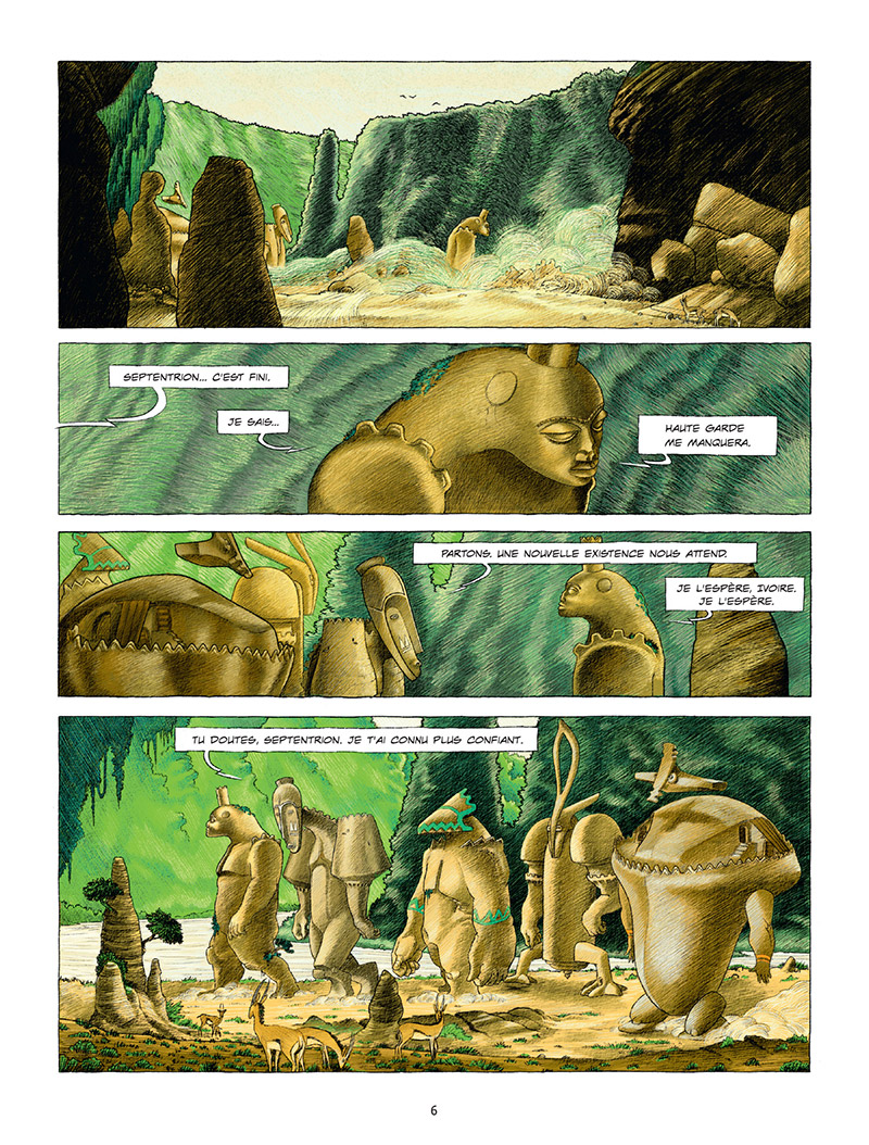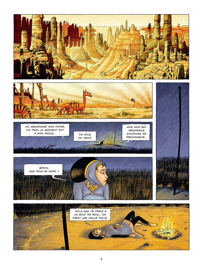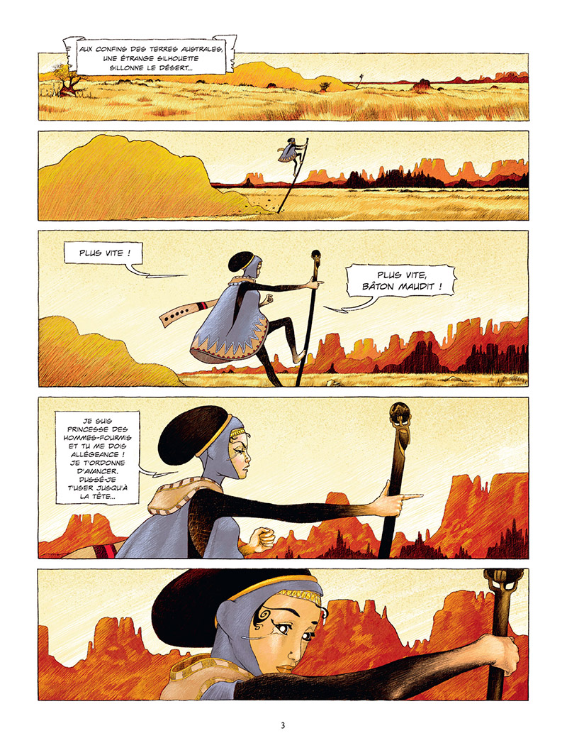 Nefer, Chants et contes de premières terres est un conte philosophique, qui nous emporte dans l’univers des croyances mystiques et des mondes mystérieux au sein d’un désert qui réserve des surprises. Arnaud Boutle nous raconte l’histoire de Nefer, la nièce du roi des Hommes fourmis, qui a fui son royaume. En chemin, elle rencontre Tour du Septentrion, un Ancien. Cet homme d’argile, d’une grande sagesse, est en train de migrer avec son peuple. Leur complicité va les porter dans ce long périple. Arnaud Boutle a lui même réalisé les dessins et la couleur qui sont d’une très grande diversité et féérie. Le monde imaginaire est si bien détaillé que l’on peut y pénétrer sans difficulté. Nefer, Chants et contes des premières terres n’est pas son premier essai (Entre les ombres/ Pinocchio…) , mais on trouve ici une magie incontestable à la lecture de ce récit.