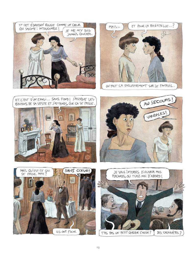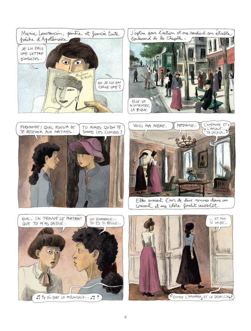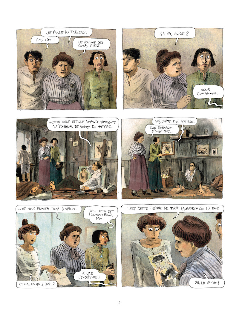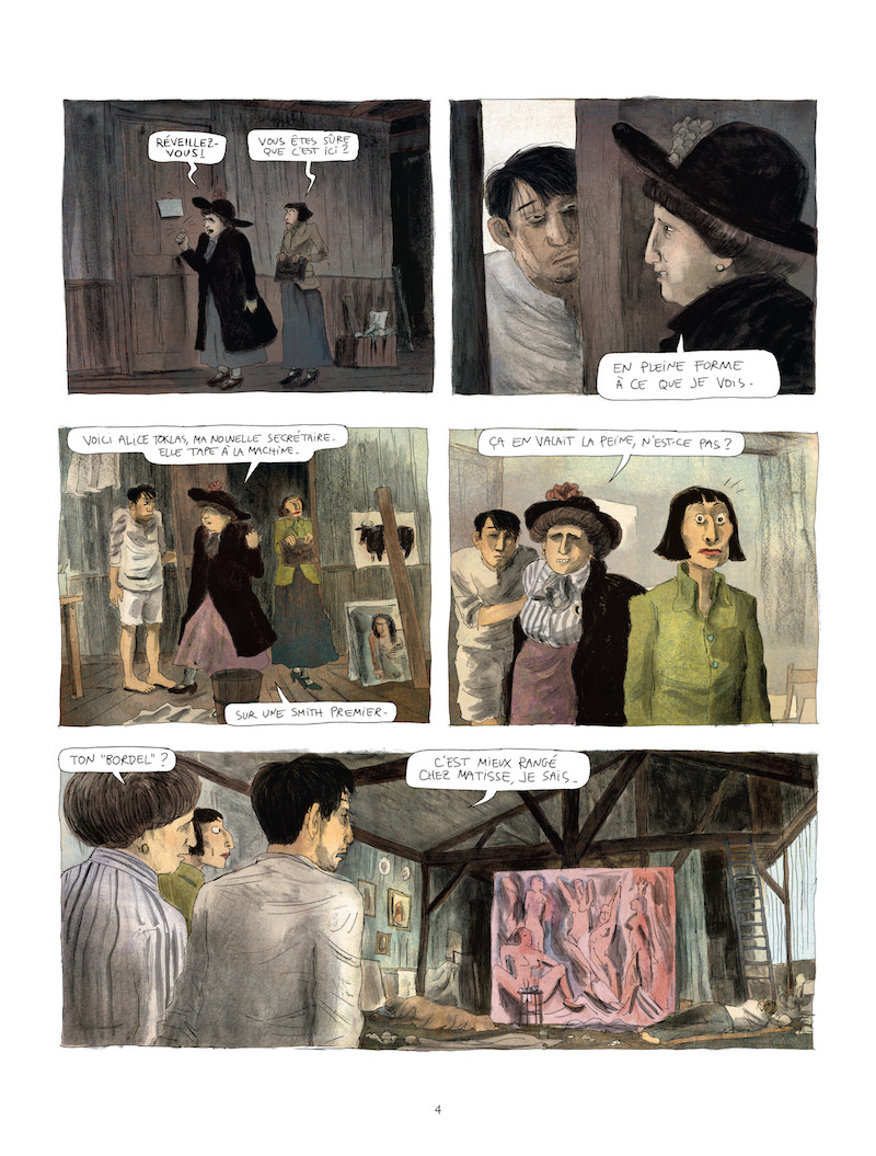 Les 4 tomes déjà parus de cette saga artistique voient Picasso côtoyer Max Jacob, Apollinnaire, Matisse et tous ceux qui ont fait l’art du XXe siècle. Georges Braques par ici, la collectionneuse Gertrude Stein par là, des noms devenus illustres constituent le quotidien d’un immigré espagnol rustre mais déterminé. Le dessinateur Clément Oubrerie lui accole d’éternels yeux grands ouverts sur le monde comme preuve de sa résolution et la scénariste Julie Birmant lui adjoint une héroïne féministe avant l’heure, Fernande, premier grand amour de sa vie. Ces deux là s’aiment et se haïssent, s’attirent et se repoussent. L’histoire d’amour devient un fil rouge des premières années parisiennes où les noms de rue raisonnent comme des endroits mythiques. La Butte Montmartre n’est qu’un terrain en friche où le Bateau Lavoir trône comme un navire échoué dans les potagers.