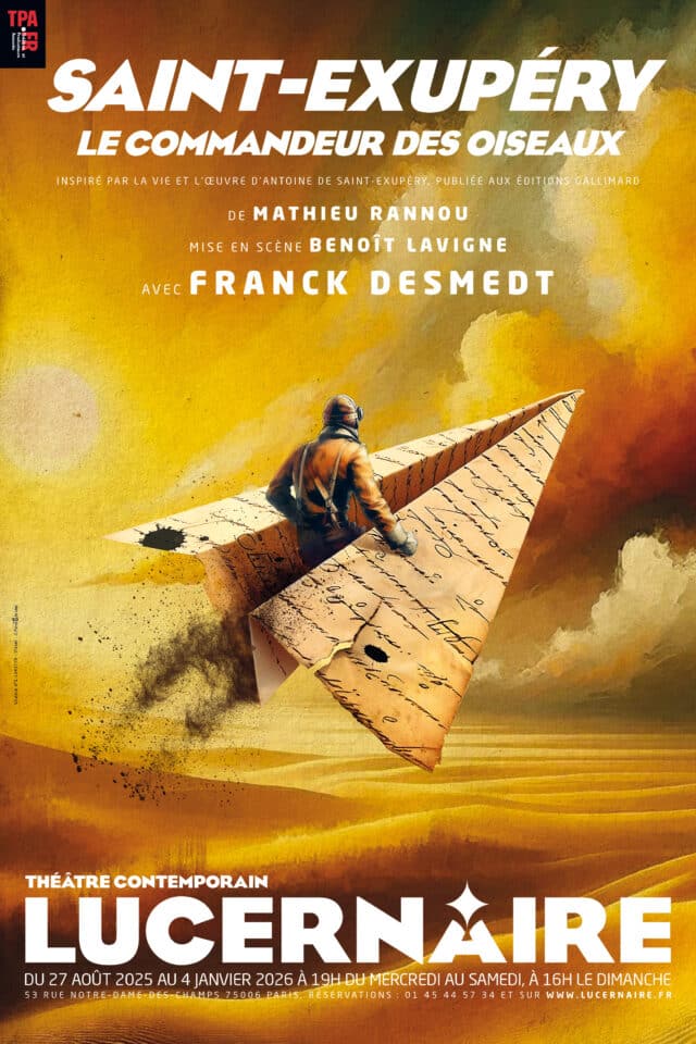 Le Lucernaire propose un spectacle prodigieux avec un seul en scène impeccable porté par un Franck Desmedt monstrueux de conviction, un vrai comédien convaincant, comique et dramatique, un narrateur hors pair parfait dans son interprétation, sans fausses notes ni anicroches. Il est la plupart du temps le célèbre auteur et aviateur Antoine de Saint-Exupéry, à la base des ouvrages ultra connus Terre des Hommes, Vol de nuit et Le Petit Prince, mais il interprète également une multitude d’autres personnages de la vie de Saint-ex, la femme de sa vie, collègues aviateurs, quidams anonymes qui ont côtoyé l’homme qui a vécu sa vie comme un défi permanent. Incapable de se poser, il a participé à l’aventure aéropostale, il a traversé le Sahara et survécu à la chaleur et à la soif, il est revenu pour combattre les nazis. Une vie d’aventure et de passion, sans concessions dans sa quête de sincérité et de vérité. Et c’est ce qui hypnotise le spectateur, car Saint-ex pourrait se poser, vivre confortablement, vieillir paisiblement, mais non, il préfère toujours tenter l’impossible pour vivre et ne rien regretter. Le comédien finit en nage, preuve de son implication et de sa passion pour ce rôle vraiment pas comme les autres. La salle du Théâtre rouge au Lucernaire était comble, la salve d’applaudissement finale était nourrie et enthousiaste. Le comédien a tout donné, le récit était criant de vérité, l’enthousiasme était total, le moment de théâtre était total. C’est rare et cher, à ne pas rater et à découvrir jusqu’au 4 janvier 2026, mais quelque chose me dit que la pièce devrait continuer plus longtemps…
