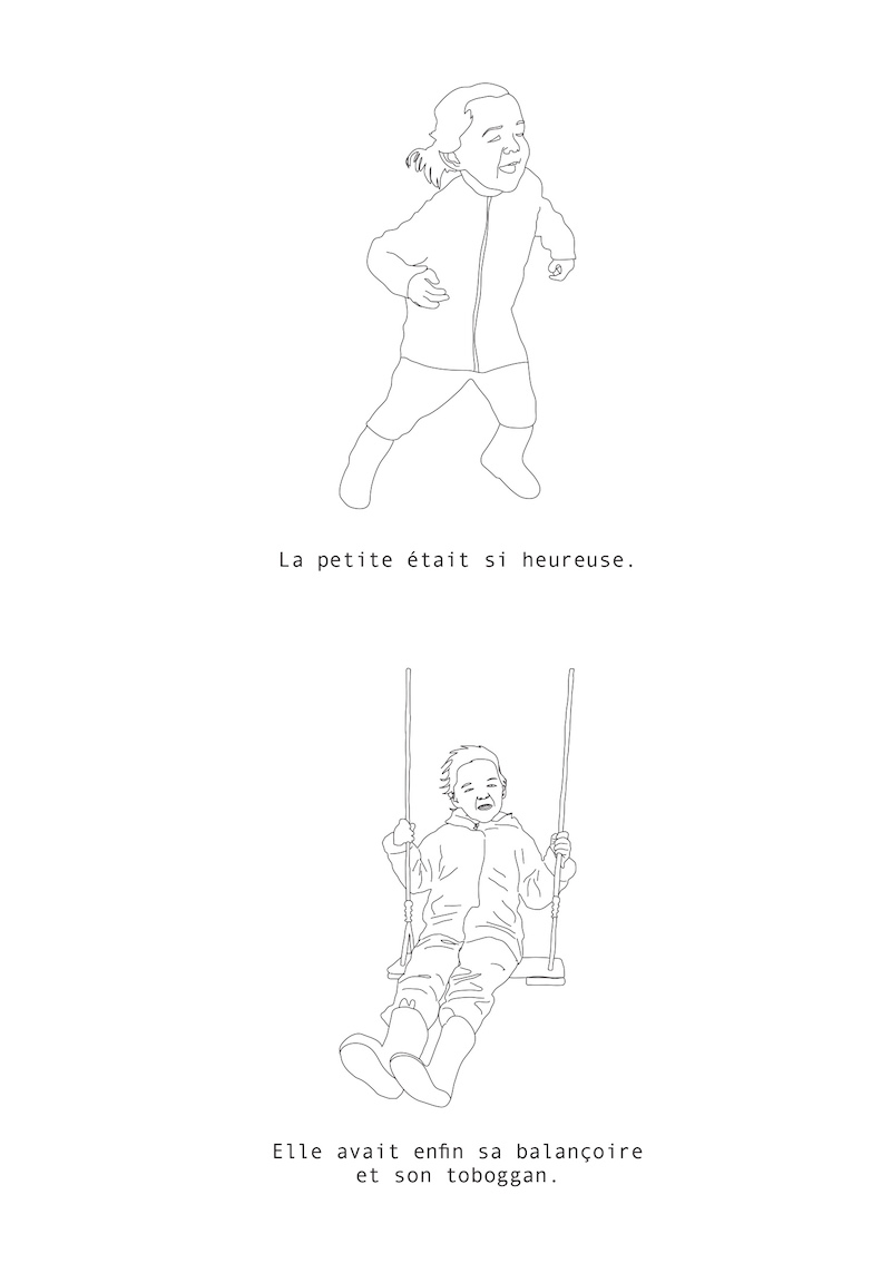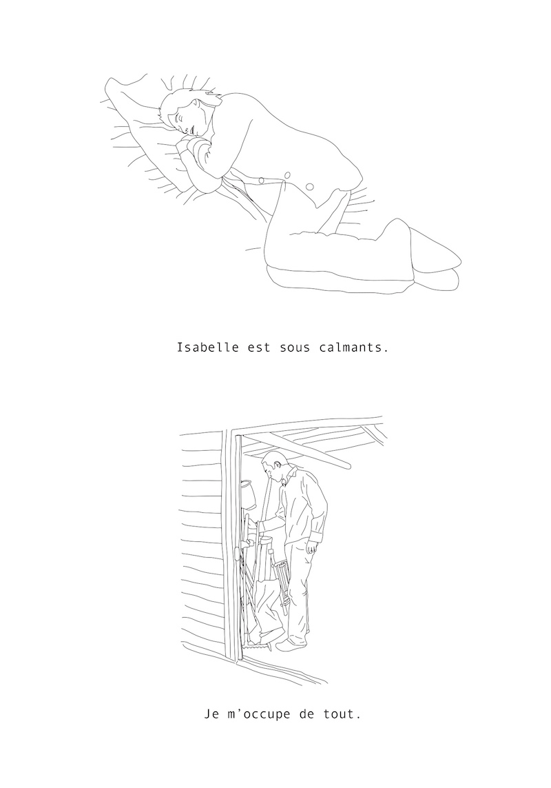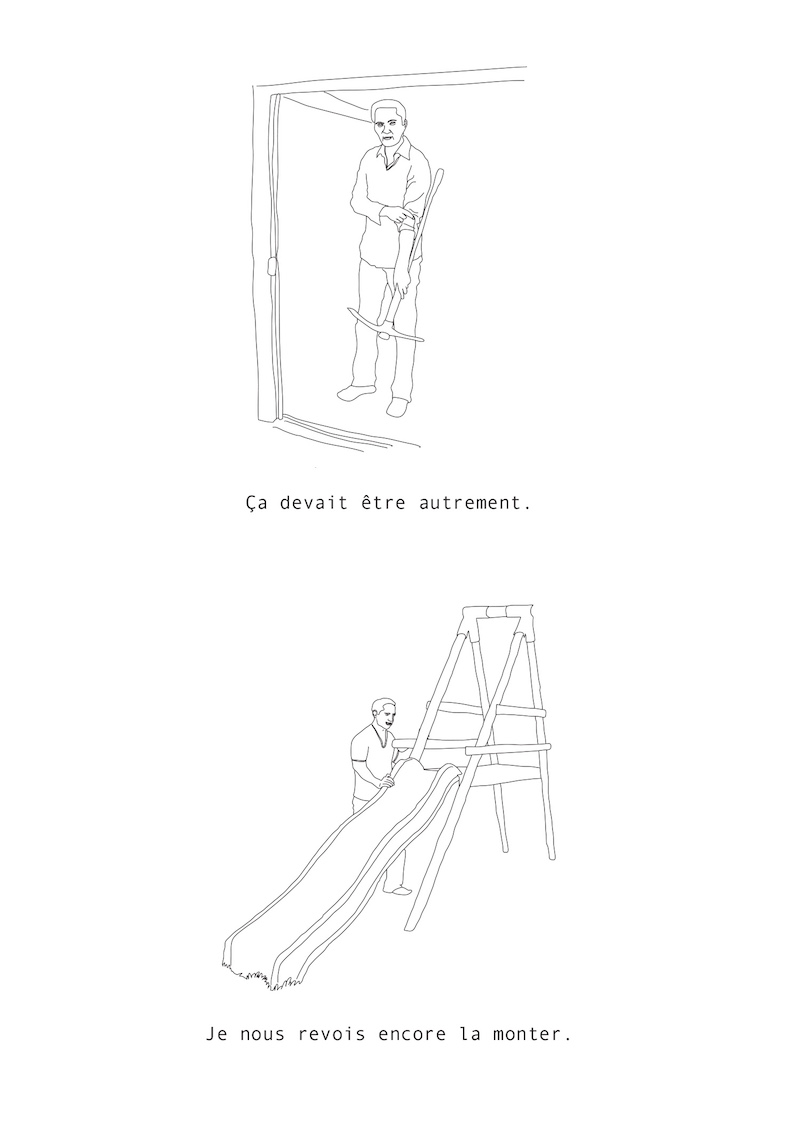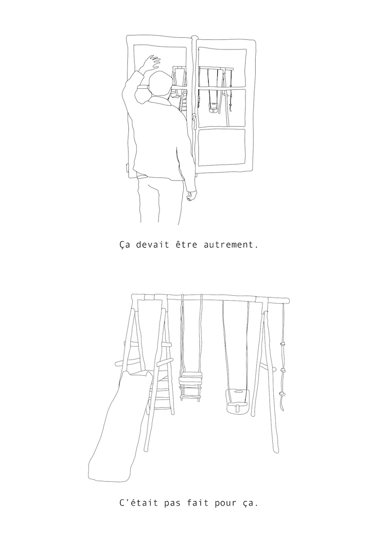 Cet épurement est foudroyant. On prend les quelques dialogues en pleine figure. Les dessins, de simples traits de crayons en noir et blanc, encore plus minimalistes, nous laissent sans voix par rapport à l’émotion qui en découlent.