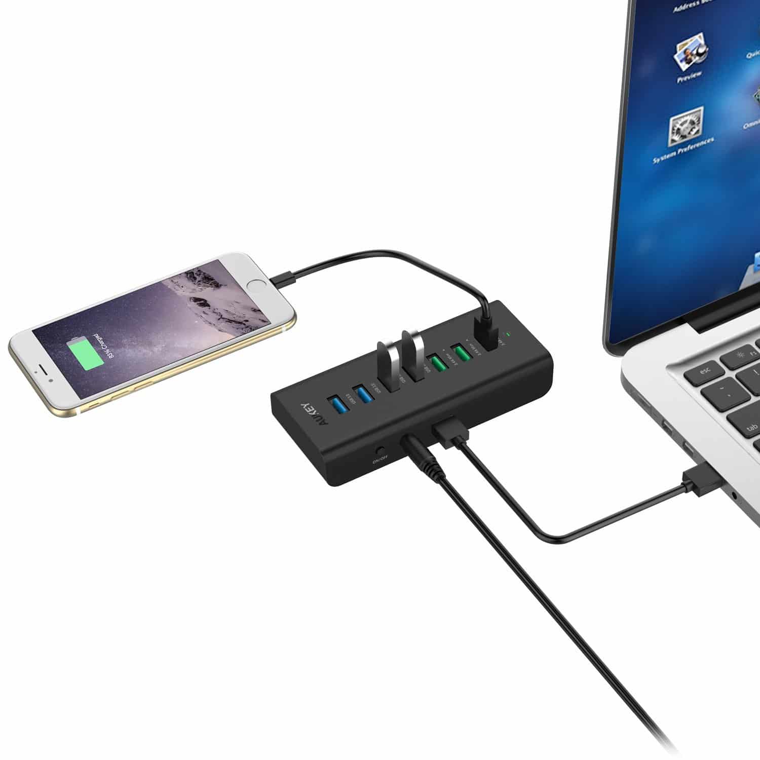 - le hub 7 ports (4 ports USB 3.0 + 3 ports de Charge 2,4A) ;