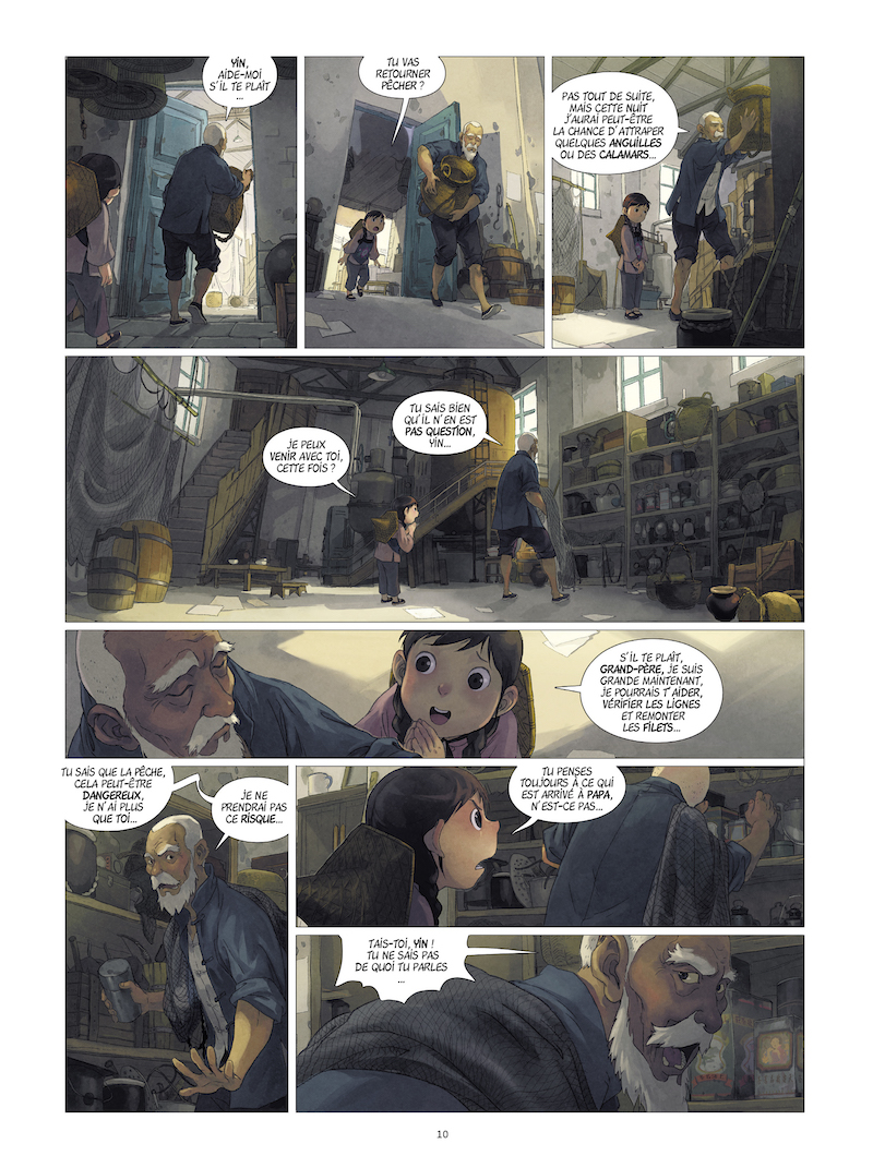 S’adressant principalement aux enfants, cette histoire nous décrit la relation forte liant un grand-père pêcheur, et sa petite-fille orpheline, Yin. Ces deux personnages sont très unis. Lui ne peut jamais rien lui refuser, et, elle, en profite pour faire bêtises sur bêtises. Une nuit, alors que le grand-père est en train de pêcher, un dragon doré se retrouve pris au piège dans ses filets. Au même moment, un bateau militaire en route vers Shangaï aperçoit cette lumière vive et tire. Le dragon est blessé. La petite fille, qui s’était caché dans le bateau, conjure son grand-père de le ramener chez eux pour le soigner. Et l’on découvre alors la relation qui est en train de naître entre cet enfant et la créature imaginaire. Les dessins de Yao Xu nous plongent dans l’univers du manga. En lisant ce livre, on retrouve l’atmosphère d’un film d’animation asiatique. On regrette néanmoins, la fin de la bande-dessinée, qui même si elle doit amener une suite, aurait pu être au moins un point-virgule.